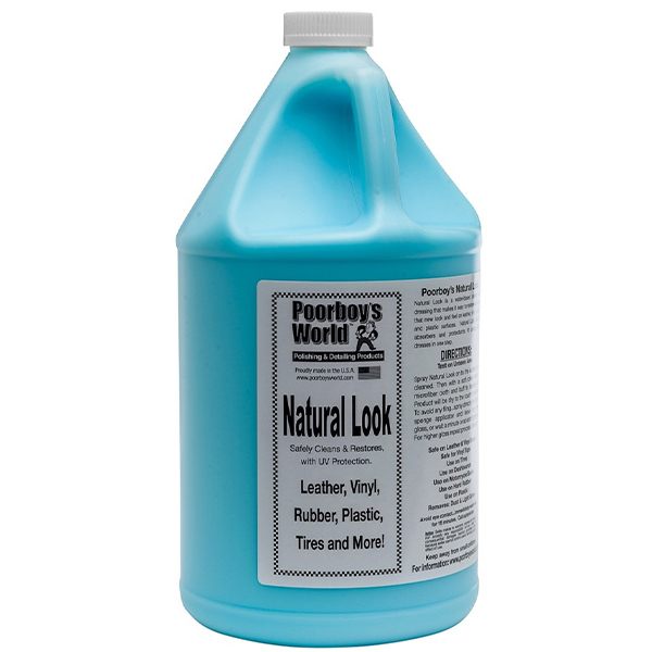 Poorboy’s World Natural Look 3785ml to środek pielęgnacyjny oparty na bazie wody. Delikatnie czyści i podkreśla naturalny wygląd powierzchni plastikowych, winylowych oraz gumowych. Pokryta produktem powierzchnia zyskuje barierę ochronną przed szkodliwym promieniowaniem UV.